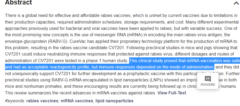 Le vaccin ARNm comme antirabique. Les anciennes générations de vaccins étant moins abordables, et efficaces en raison des capacités de productions, les premiers essaies cliniques avec l’ARNm étant prometteur, on étudie l’ARNm comme antirabique (sept. 2019) https://www.mdpi.com/2076-393X/7/4/132